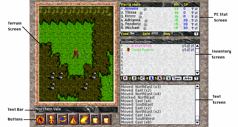 You will now be looking at the main Blades of Exile screen. This screen has six distinctive parts.